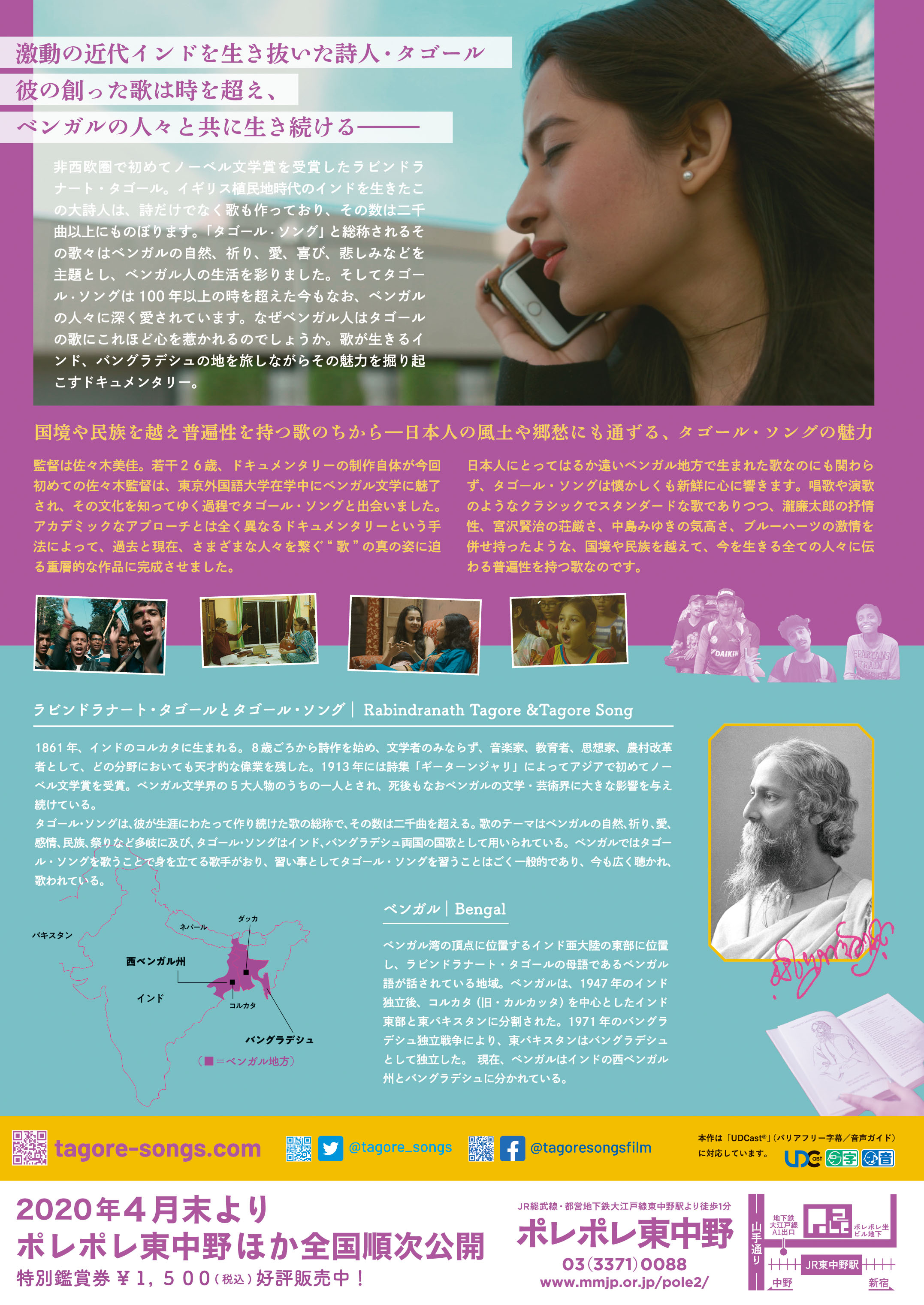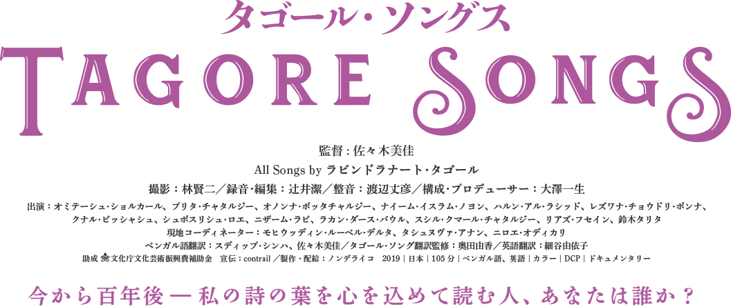 非西欧圏で初めてノーベル文学賞を受賞したラビンドラナート・タゴール。イギリス植民地時代のインドを生きたこの大詩人は、詩だけでなく歌も作っており、その数は二千曲以上にものぼります。「タゴール・ソング」と総称されるその歌々はベンガルの自然、祈り、愛、喜び、悲しみなどを主題とし、ベンガル人の単調であった生活を彩りました。そしてタゴール・ソングは100年以上の時を超えた今もなお、ベンガルの人々に深く愛されています。なぜベンガル人はタゴールの歌にこれほど心を惹かれるのでしょうか。歌が生きるインド、バングラデシュの地を旅しながらその魅力を掘り起こすドキュメンタリー。